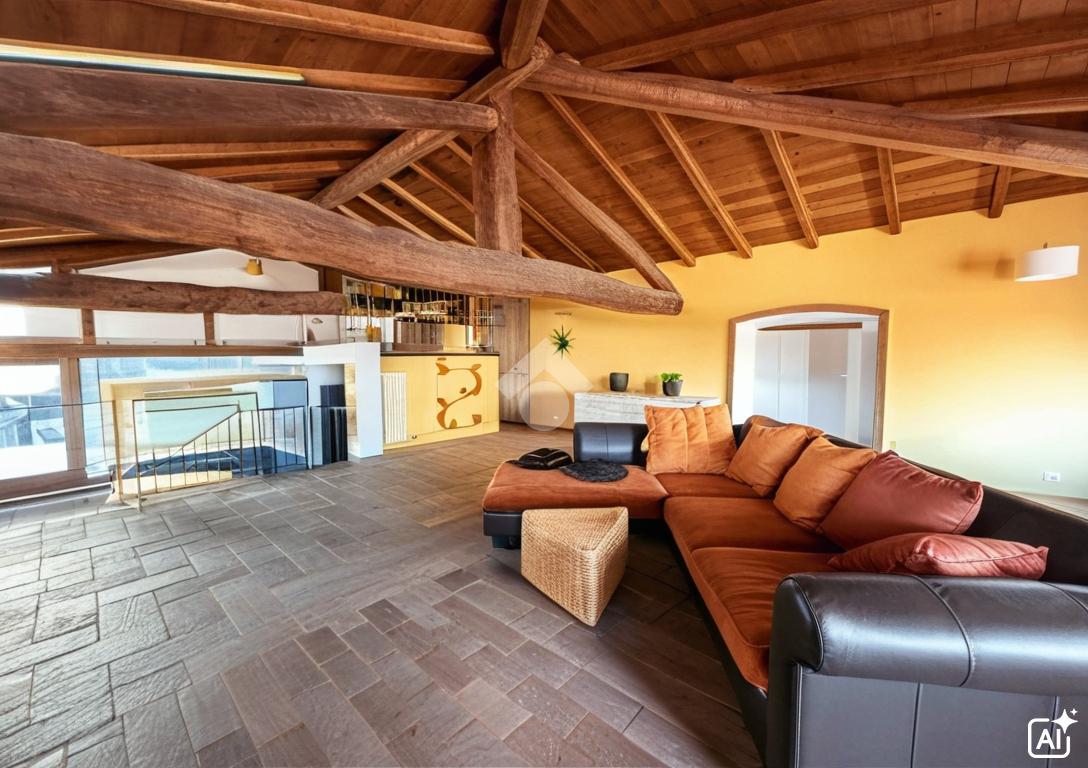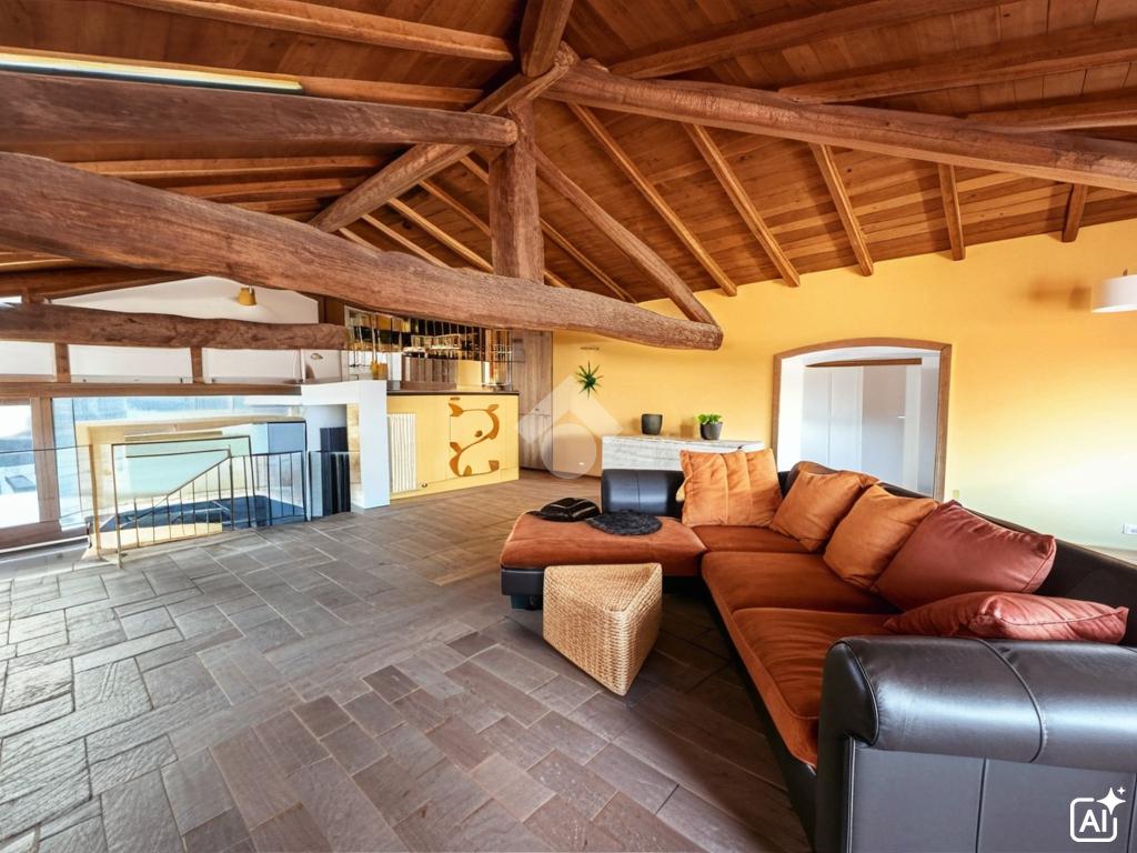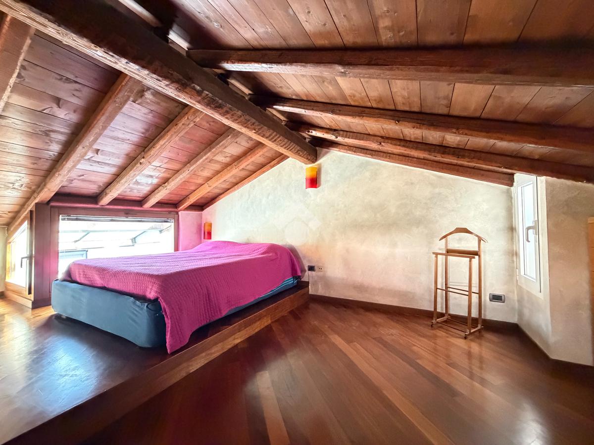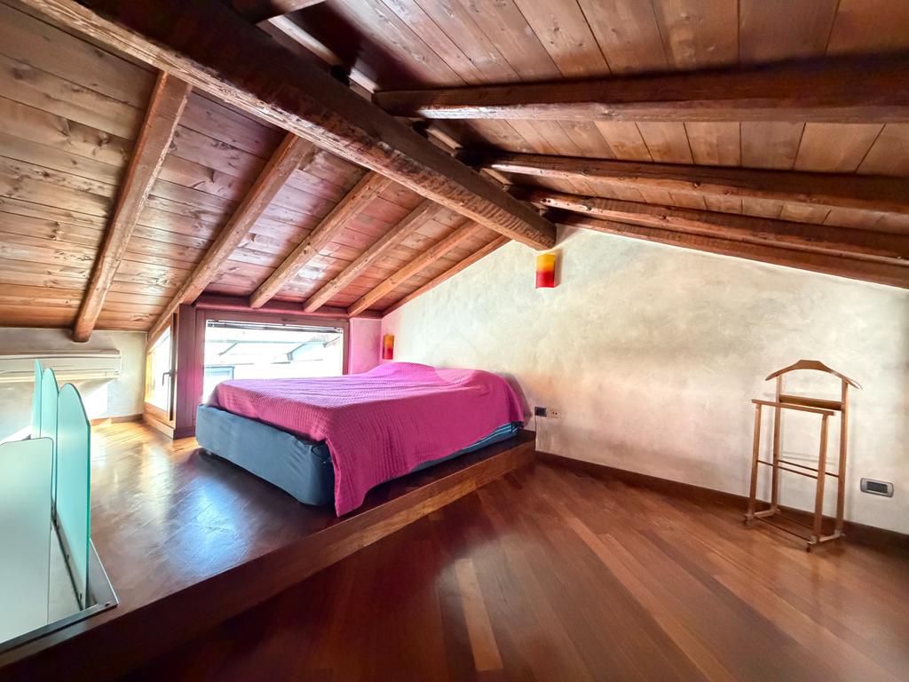Bilocale mansardato stile loft con travi a vista, soppalco e terrazzo.