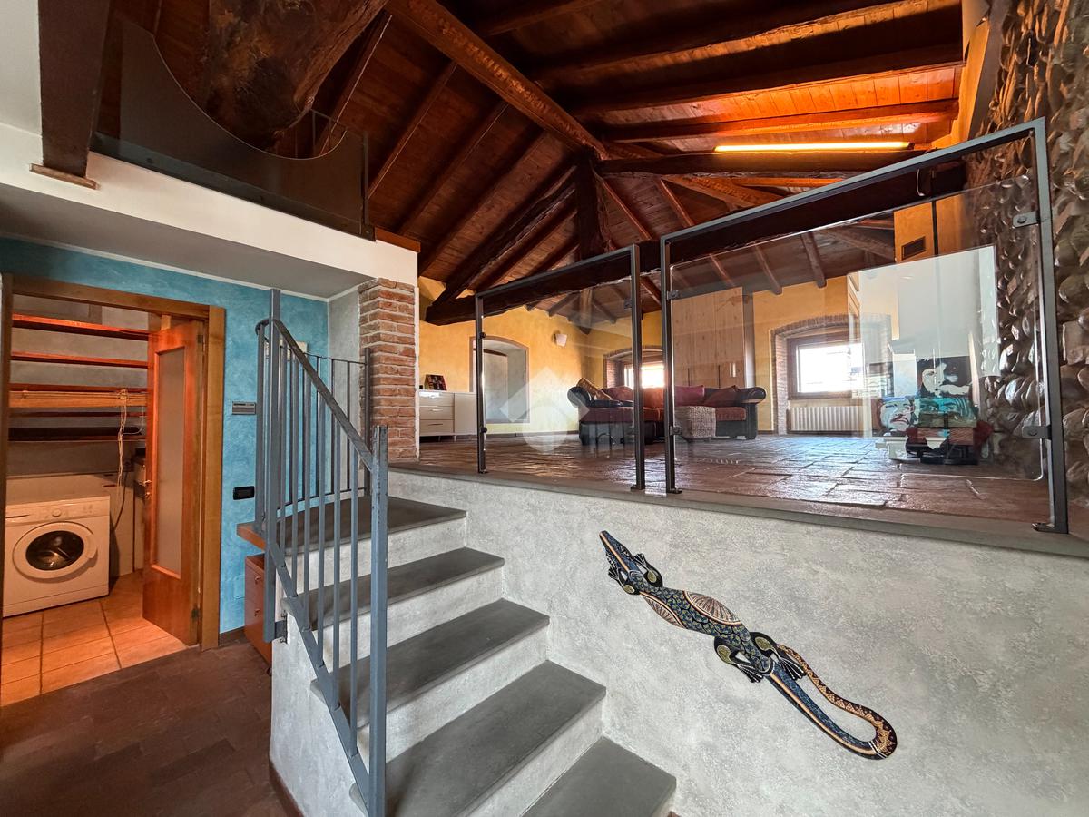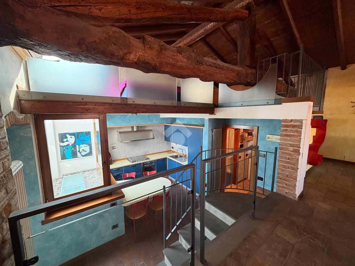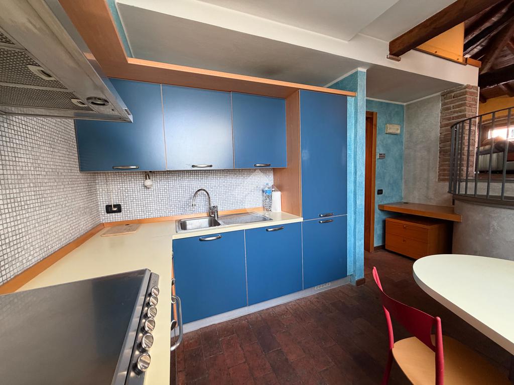 In decoroso contesto di corte ben tenuta nel centro del paese, proponiamo in vendita un caratteristico appartamento bilocale mansardato in stile loft, situato al secondo ed ultimo piano.