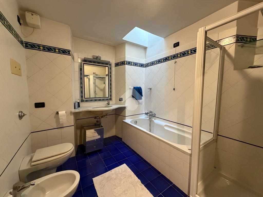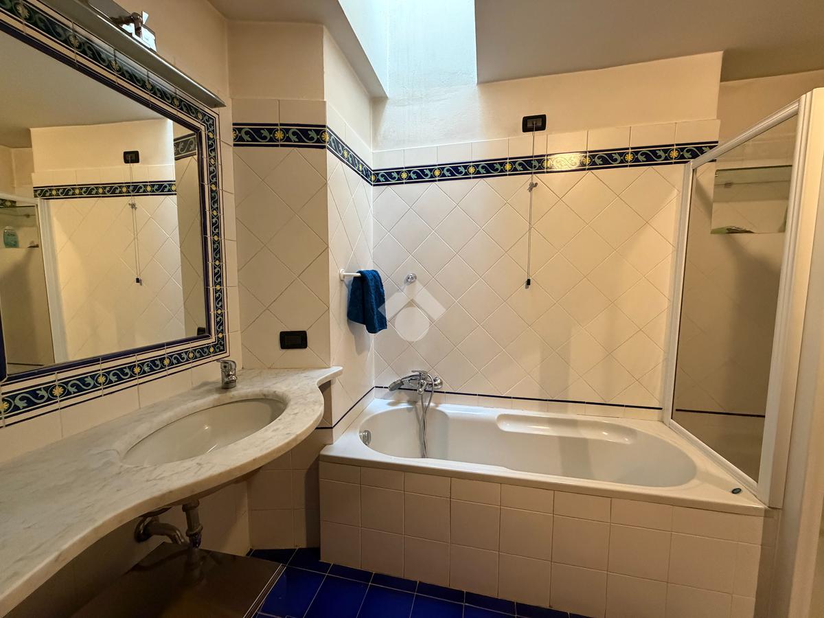 La zona giorno è completata da una cucina a vista angolare, un disimpegno con armadiatura e spazio dedicato alla lavanderia, oltre ad un bagno con lucernario, completo di vasca e doccia.